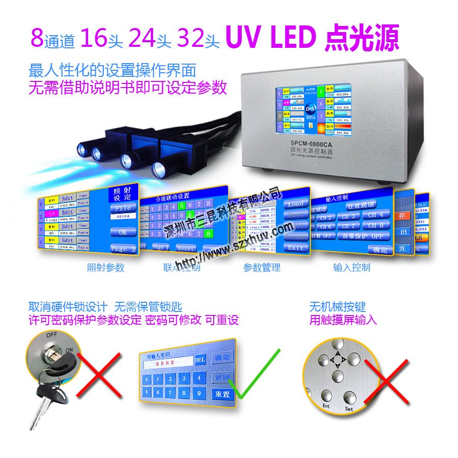 UVLED點(diǎn)光源控制器用專用的LED驅(qū)動(dòng)IC,采用開關(guān)式恒流驅(qū)動(dòng)控制,適應(yīng)寬電壓輸入,效率高,驅(qū)動(dòng)IC不需要添加散熱器,控制器為全鋁機(jī)箱全密封,長(zhǎng)時(shí)間持續(xù)使用的情況下機(jī)箱內(nèi)外溫度都還是很低。電路設(shè)計(jì)中所有需要考慮電流通過能力的場(chǎng)合,都采用了高余量設(shè)計(jì),不存在局部發(fā)熱的問題,所以主機(jī)很耐用和很穩(wěn)定;